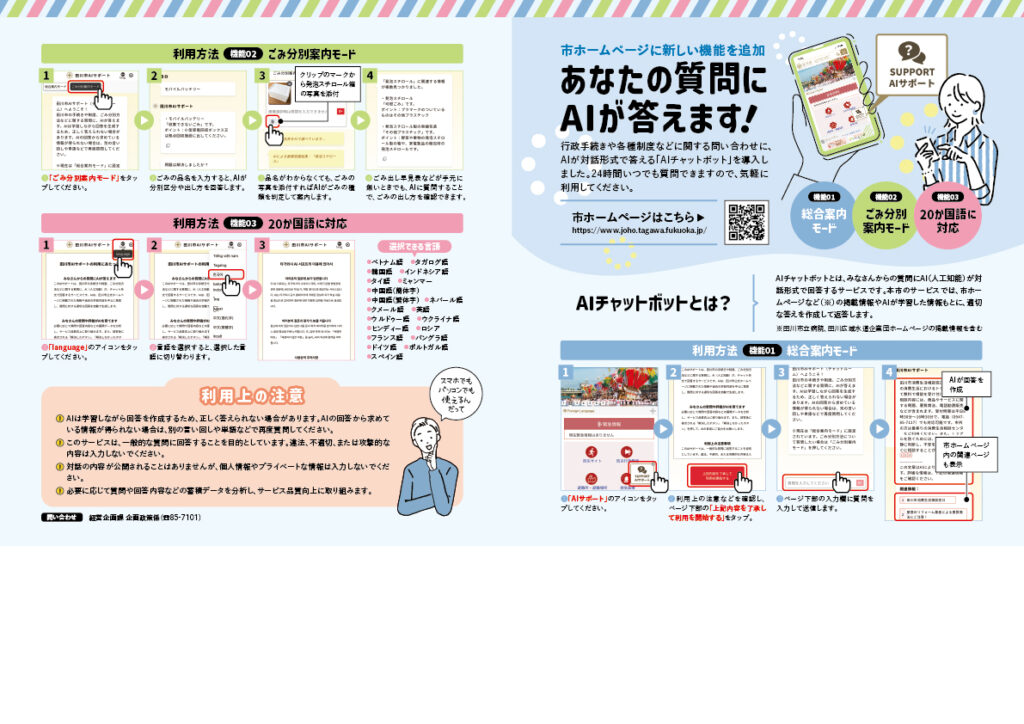 市民広報用データ作成(チャットボット) 2026年3月13日 最終更新日時 : 2026年3月13日 link-admin お客様:福岡県田川市役所 総務部 経営企画課 企画政策係様市民広報用データ作成(チャットボット)をご依頼いただきました。